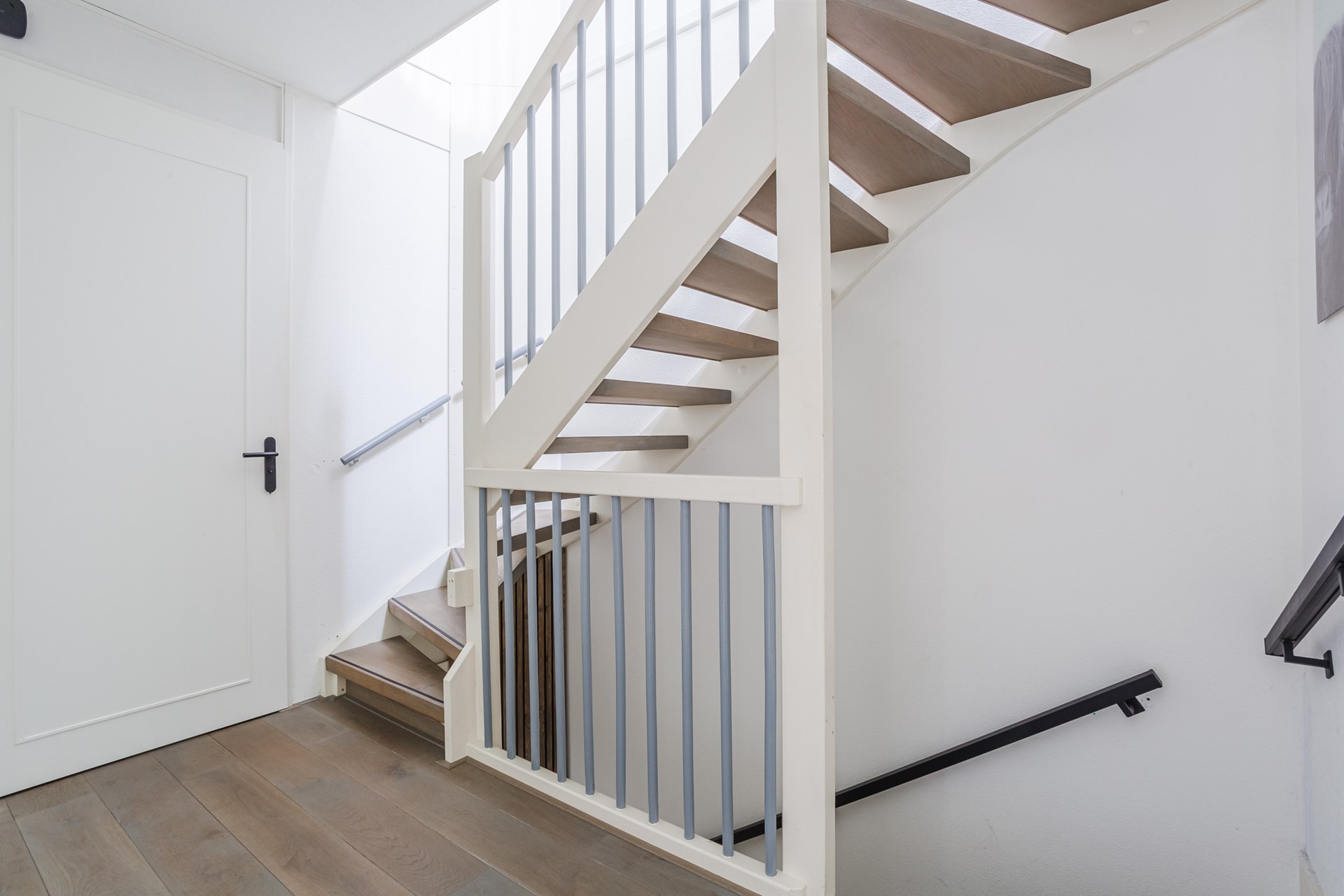 Hier vind je links achtereenvolgens een op maat gemaakte inbouwkast, een separate toiletruimte (met vrij hangend toilet en fonteintje) en de trapopgang.