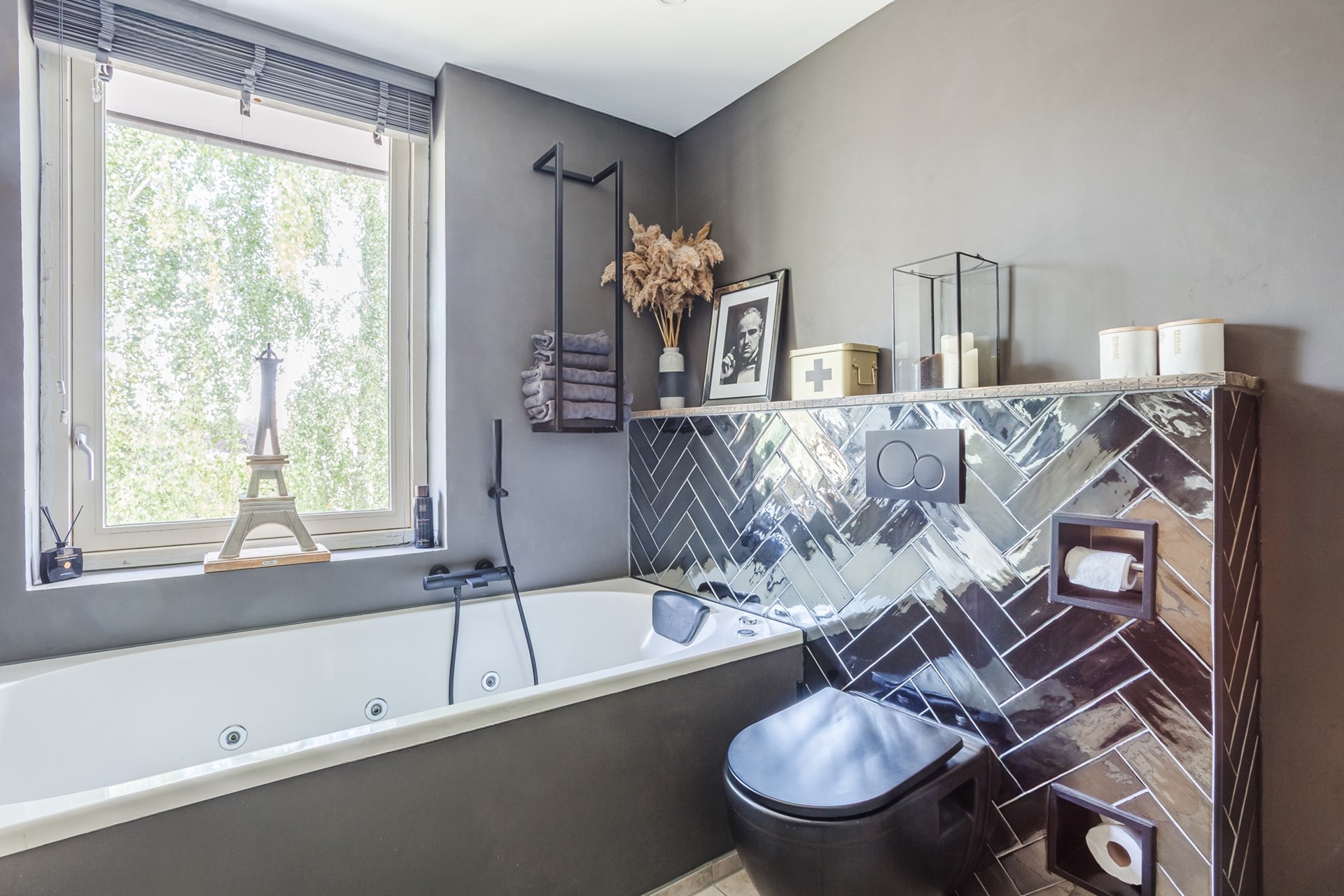 Daarnaast biedt de tussenverdieping een luxe badkamer met stijlvolle betegeling.