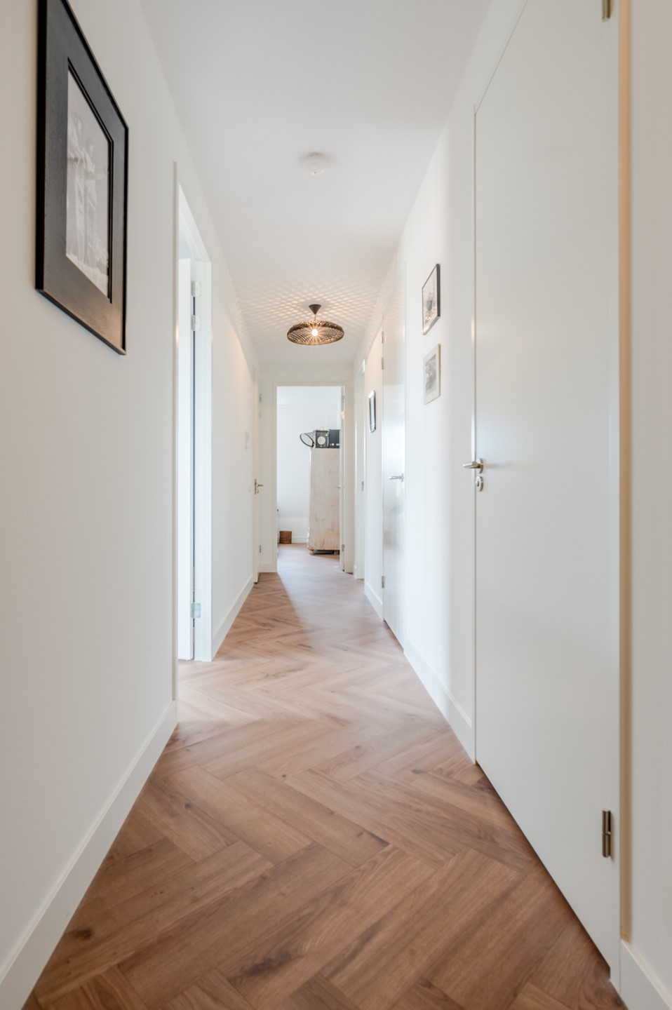 Op de vloer ligt een prachtige PVC-laminaatvloer met visgraatmotief en vloerverwarming, die doorloopt in het gehele appartement.