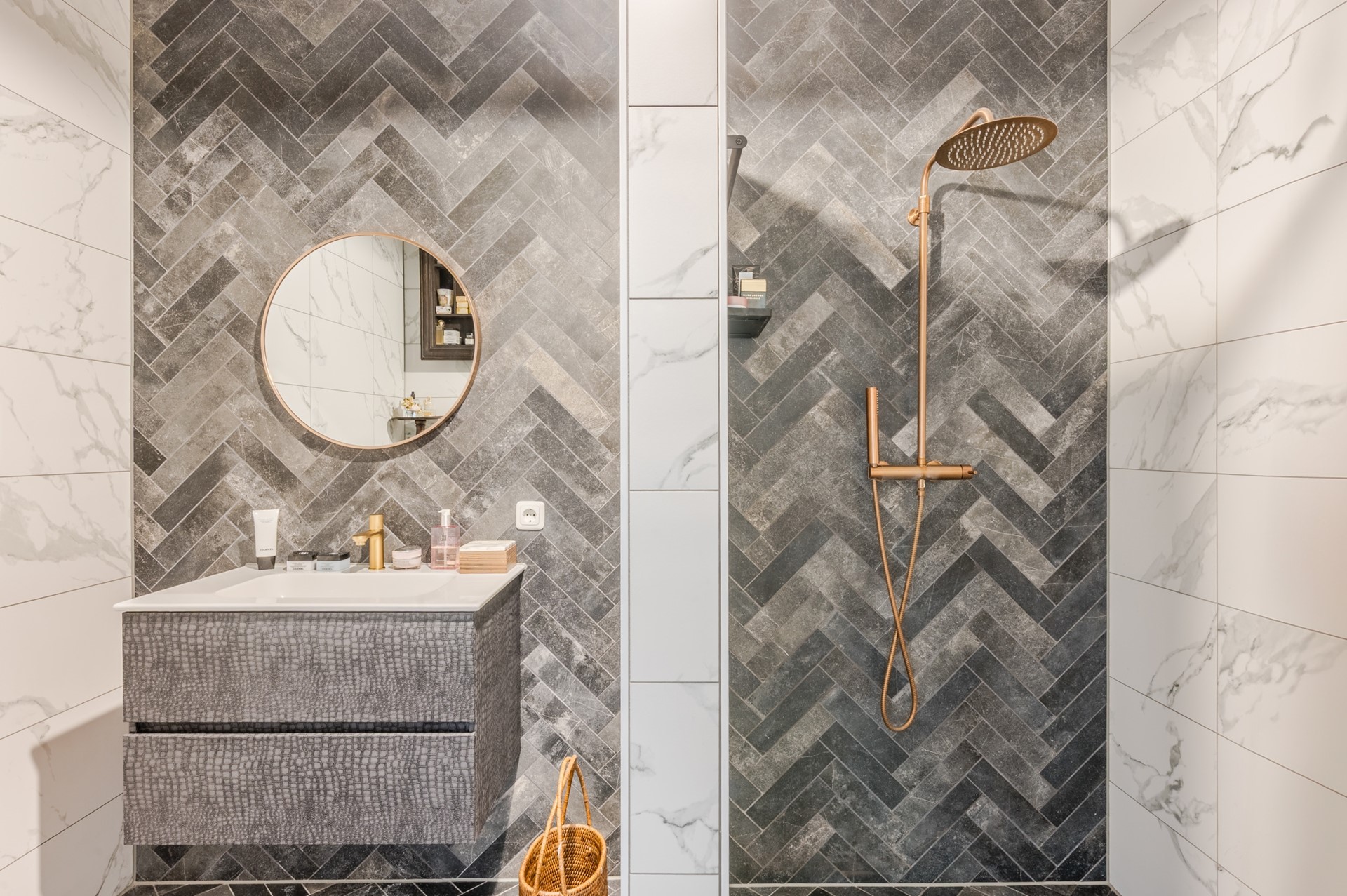 De grote en moderne badkamer is voorzien van grijze en witte tegels.